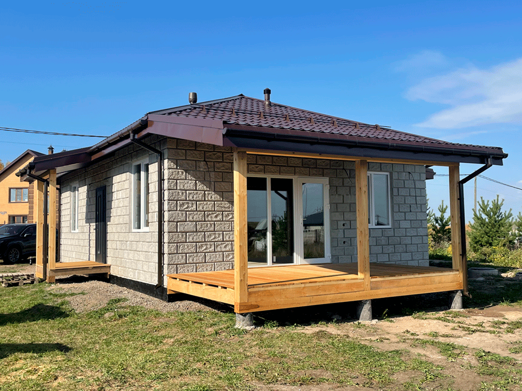 + Теплоэффективность (за счет внутреннего утепления в блоке); Доступная цена; Эстетика фасада (легко менять цвет), Практически круглогодичное строительство.