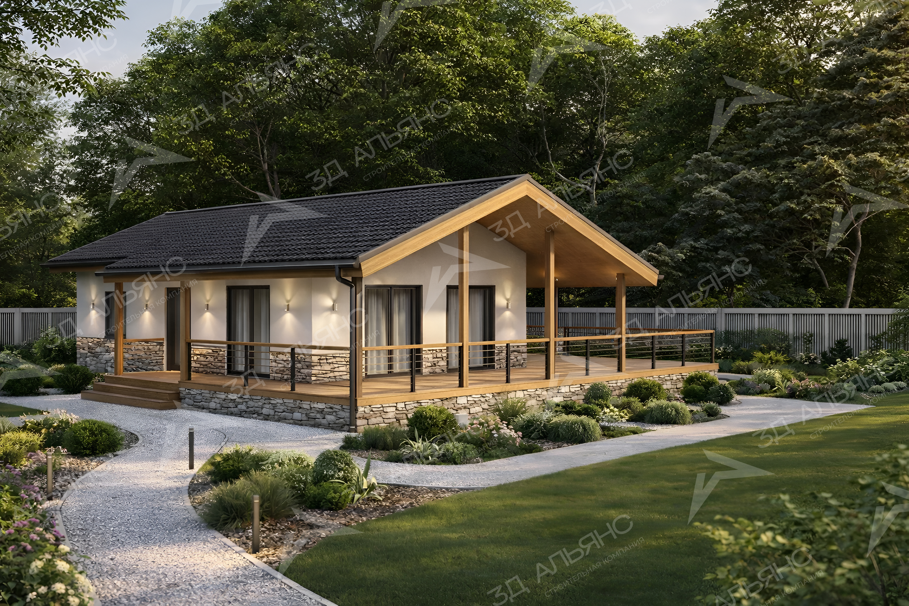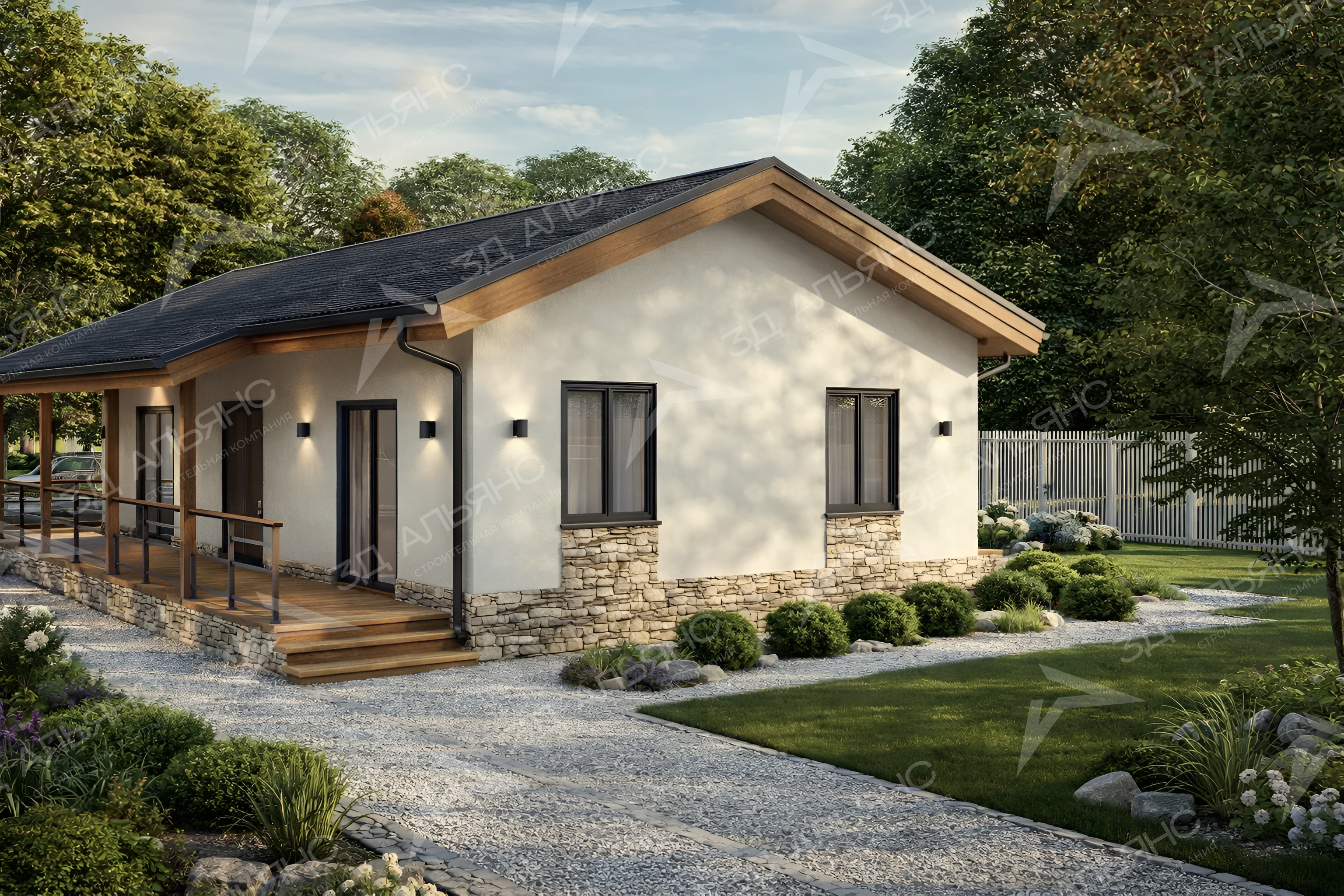 Проект Фин-Хит — современный дом из бруса, где дерево поёт и свет живёт. Формат 8,5×14,5 м на одном уровне! Жилая площадь 61,39 м² — размер точный, ритм спокойный. Светлый сайдинг с каменным цоколем подчеркивает чистые линии фасада; тёплые деревянные балки и тёмная двускатная крыша с глубокими свесами придают силуэту уверенность и лёгкость. Крыльцо встречает мягким шагом ступеней, а широкая терраса, словно борт корабля, огибает дом — здесь ветер нашёптывает истории. Тонкие чёрные перила, аккуратные водостоки, подсветка на стенах — детали, что делают вечер бархатным. Извилистая гравийная дорожка ведёт сквозь ухоженный сад к тиши леса за оградой. Внутри — ясная логика и поэзия пространства: 3 комнаты, из них 2 спальни для сна без спешки. Гостиная раскрывается вторым светом под коньком, и панорамные окна впускают зелёную симфонию двора; рассвет входит крупным планом, закат растворяется в стекле. Один этаж — всё рядом, всё ладно.
