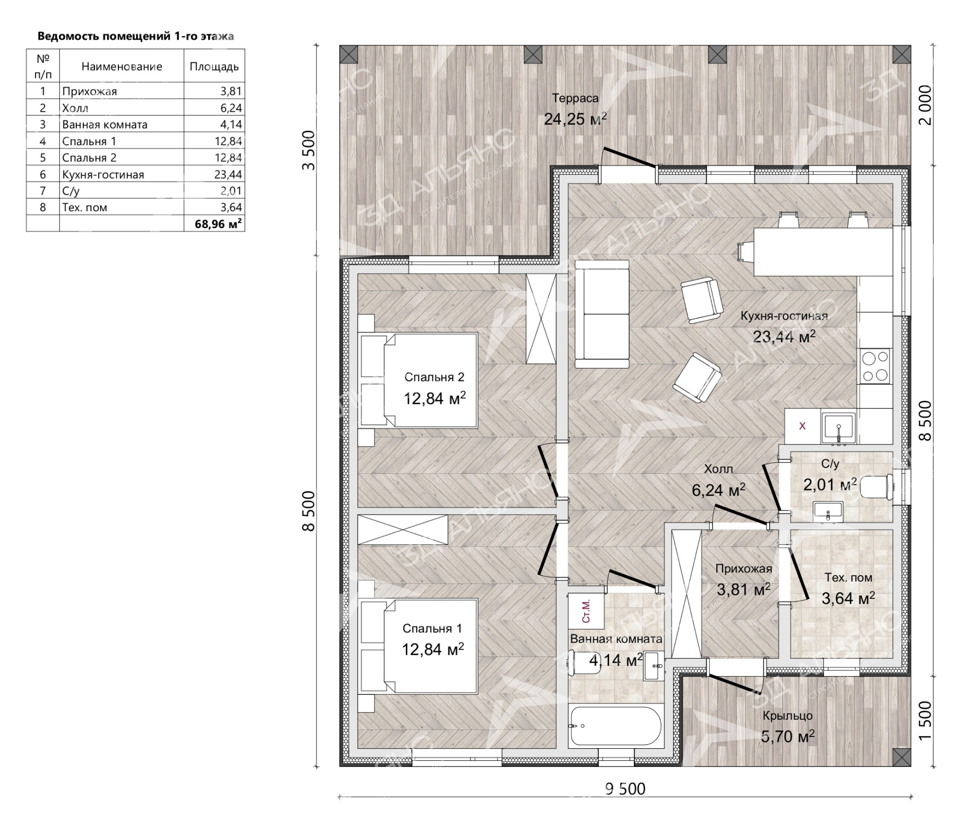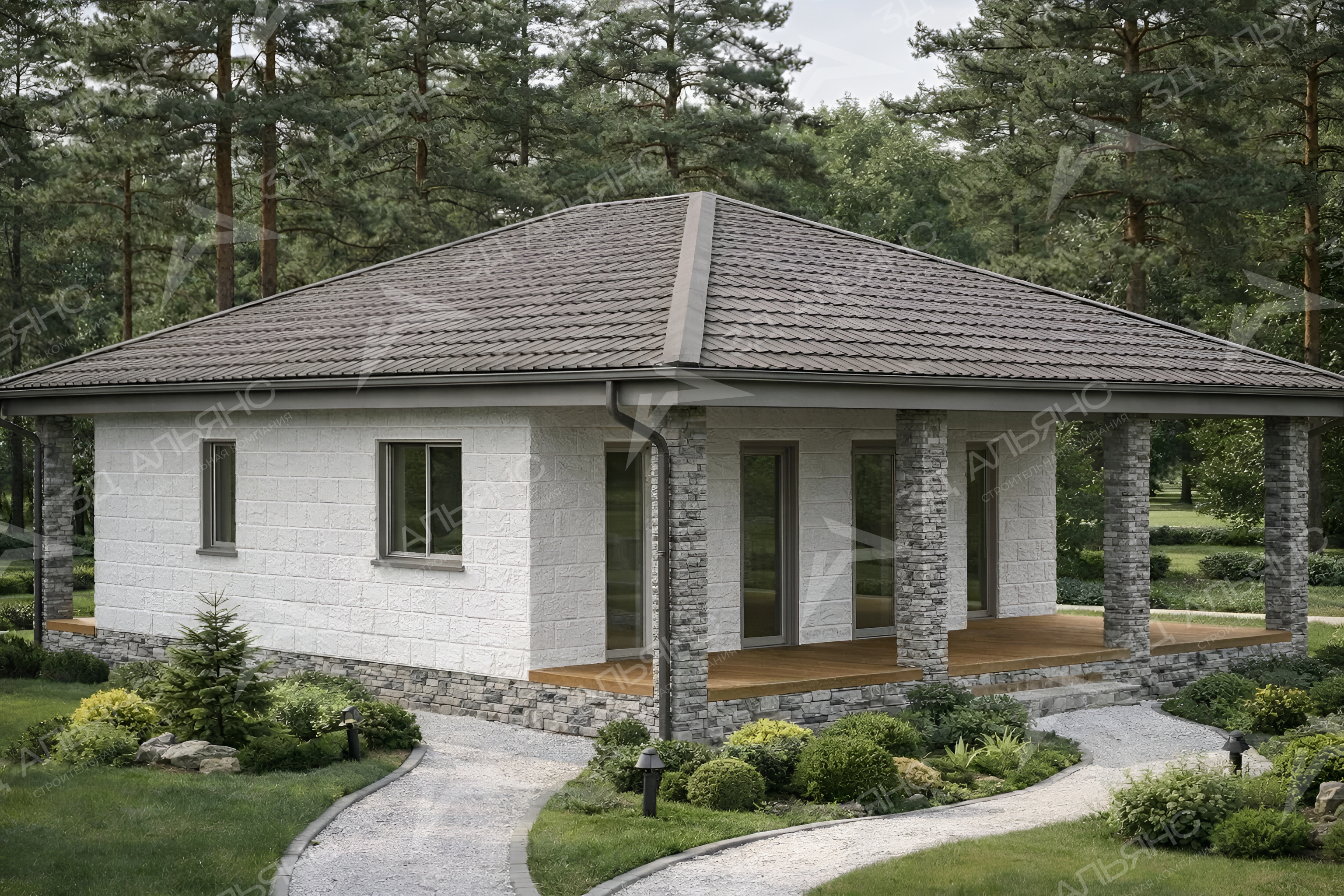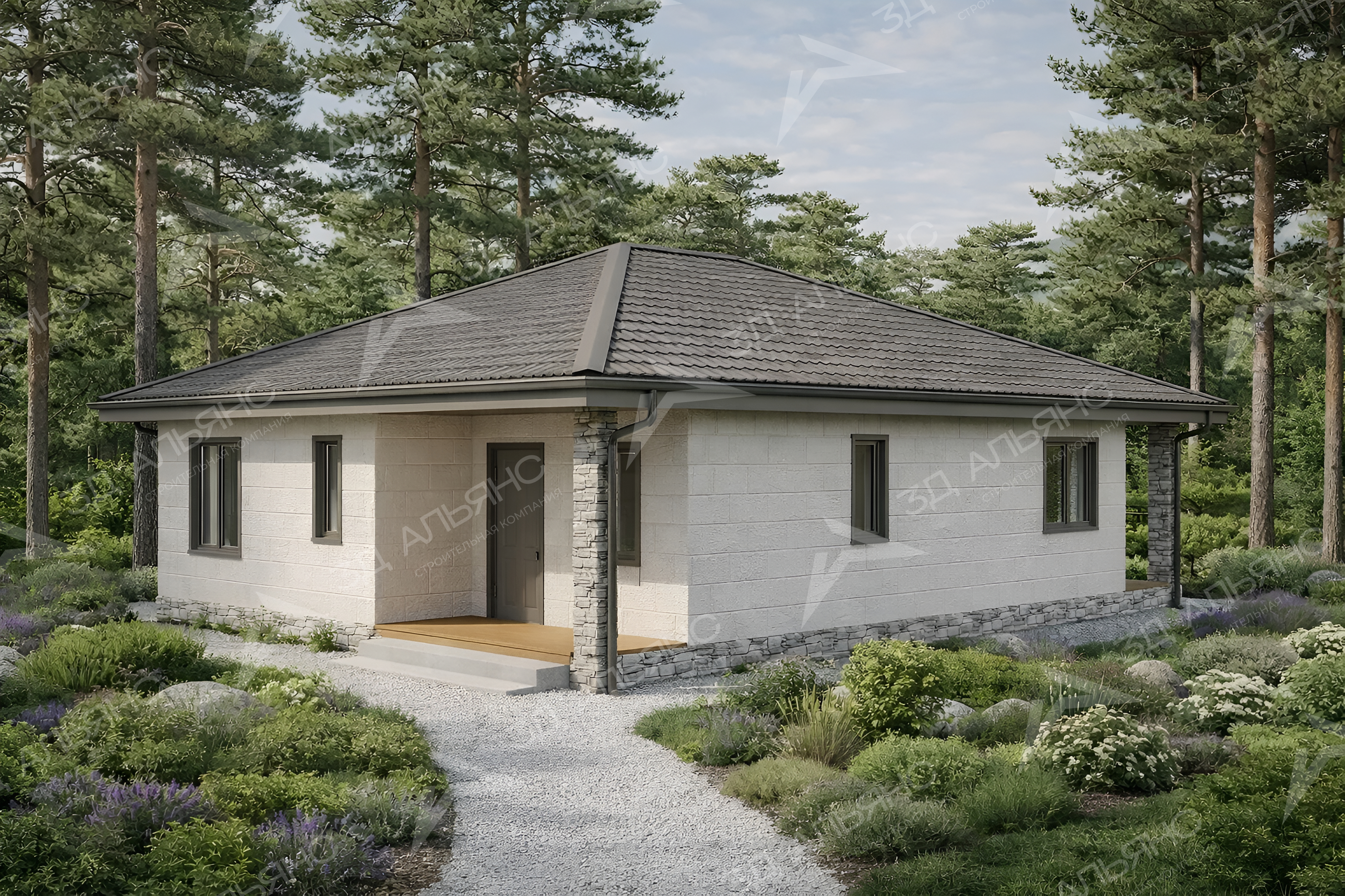 Проект «Монте» — дом ясных линий и степенной гармонии. На полезной жилой площади 68,96 м², в габаритах 9,5×12, он раскладывает быт на простые ноты: один этаж — без суеты, три комнаты — по сердцу, две спальни — для тишины. Классический характер читается в пропорциях и колоннах: устойчивость формы, благородная простота. Стены из теплоблока, бережно окрашенные, держат тепло, как ладонь, и мягко отражают свет. Над ними — вальмовая крыша под серой черепицей: уверенный штрих, широкий свес, спокойная тень. Каменный цоколь и облицовка колонн добавляют рельефа, будто низкая прелюдия к мелодии уюта. Примечательно, что дом сочетает комфорт и стиль. Крыльцо встречает, как тихий перрон: шаг — и мир замедляется. Большая терраса — деревянный подиум воздуха, где утро распахивает плечи. Панорамные окна с тонкими серыми рамами впускают сад внутрь — сосны становятся занавесом, а зелёные волны кустарников звучат как аккорд покоя. Светлые извилистые дорожки ведут к порогу, ландшафтные фонари расставляют вечерние запятые. Внутри — пространство, настроенное на гармонию: кухня-гостиная для разговора у тепла, две спальни для снов без края.