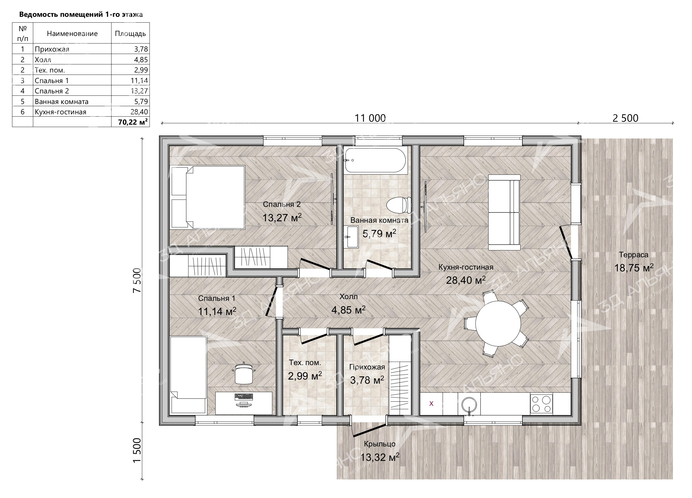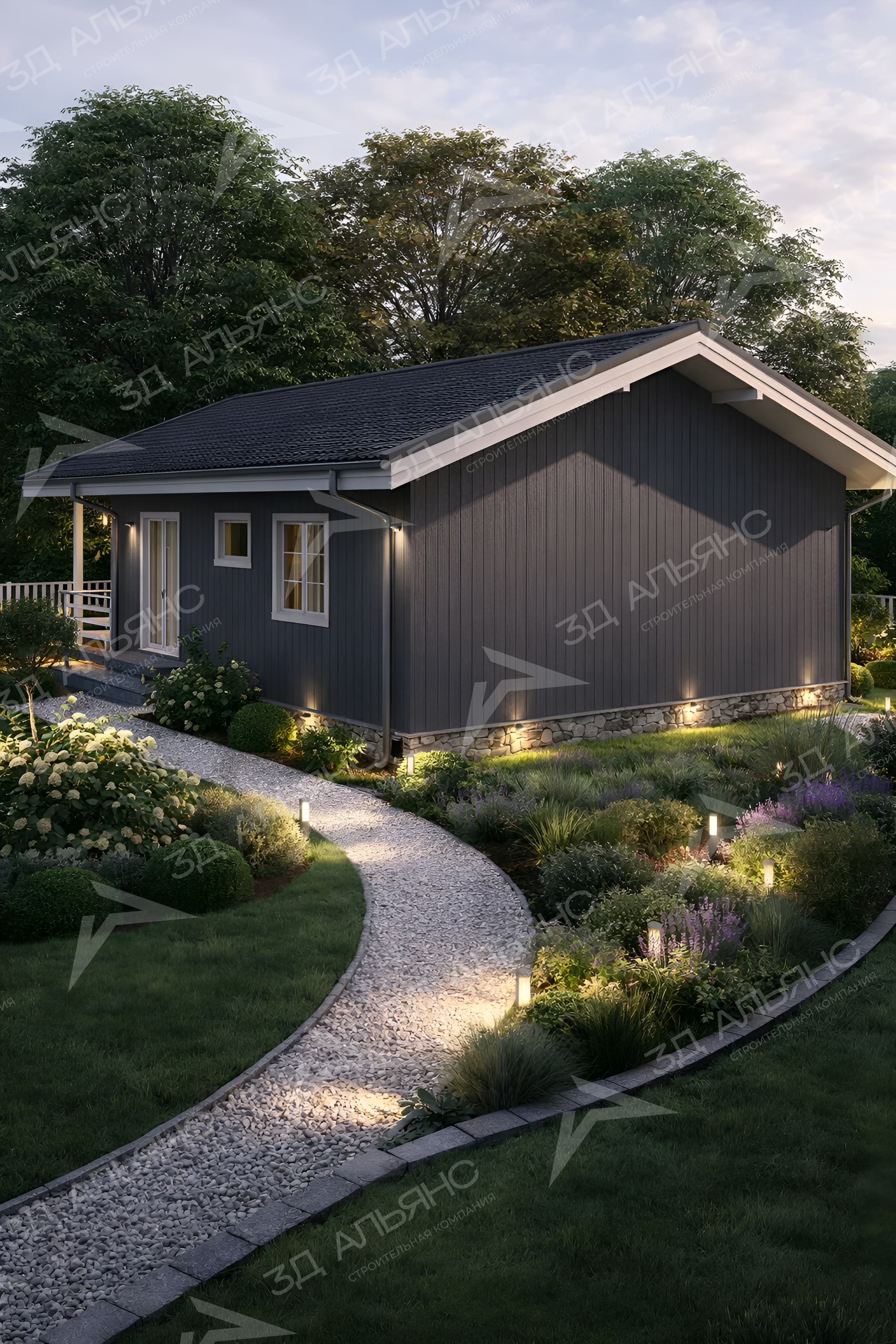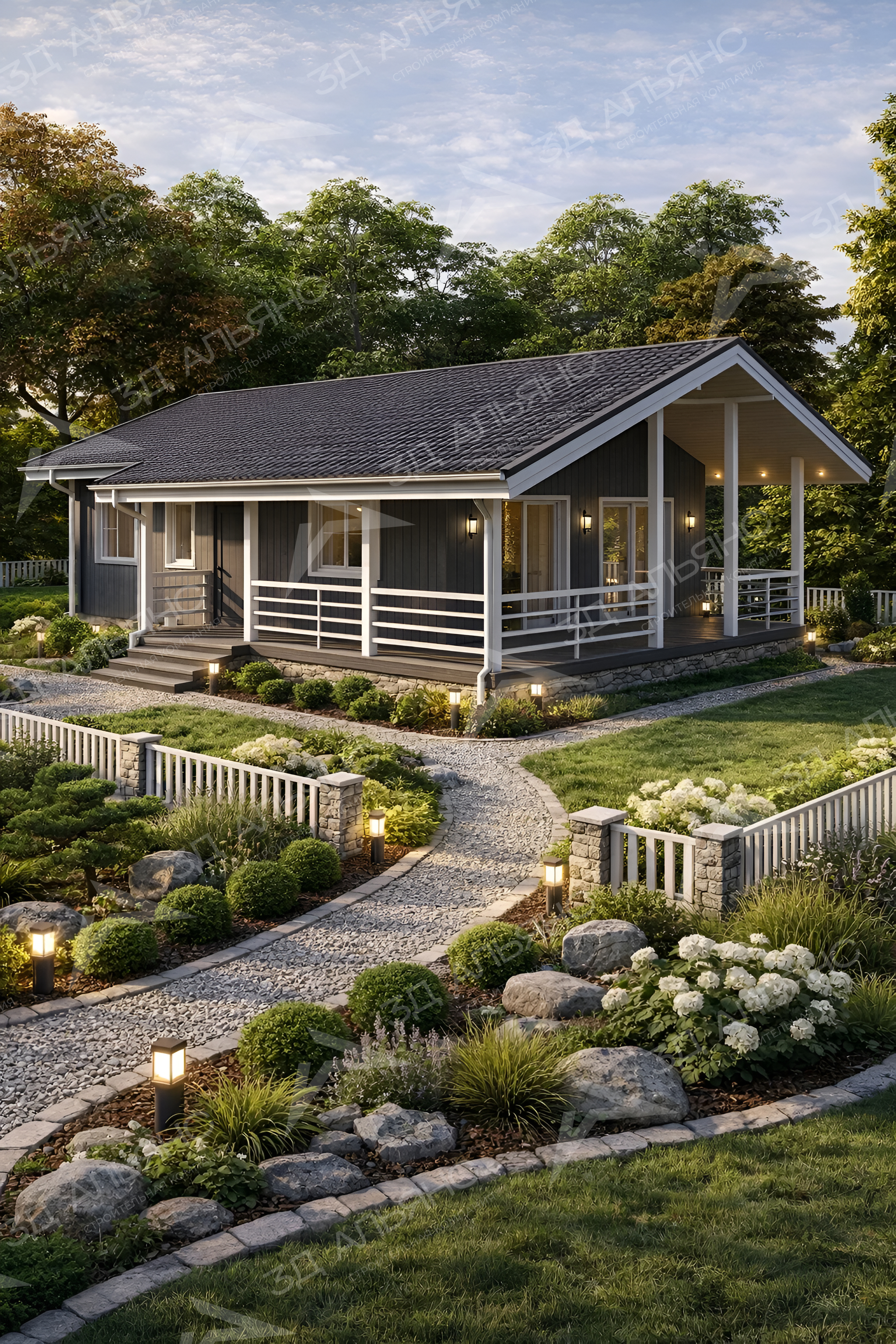 Проект «Престиж К2» — современный каркасный дом в стиле Contemporary, внешними размерами 9×13,5 м и общей жилой площадью 70,22 м², созданный для яркой и спокойной загородной жизни. Фасады отделаны имитацией бруса в благородном графитовом тоне с белыми акцентами, подчеркивающими чистую геометрию. Двускатная кровля и аккуратный каменный цоколь гармонируют с ландшафтом; вечернюю атмосферу уютно поддерживают фасадные бра и садовые светильники. Планировка на одном уровне включает 3 комнаты: просторную общую зону и 2 уединённые спальни. Сердце дома — гостиная со вторым светом: высокий объём и панорамные окна дарят много воздуха и солнца. Отсюда — прямой выход на широкую террасу, где приятно встречать рассвет и собирать семью за тёплыми беседами. Уютное крыльцо со ступенями приветствует гостей и защищает от непогоды. Архитектурный ритм формируют лаконичные перила и высокие стойки под фронтоном, зрительно увеличивающие пространство террасы. Дом мягко «врастает» в участок: гравийные дорожки, невысокий забор на каменных столбах, аккуратные кустарники и цветники образуют живописную рамку и поддерживают ощущение приватности.