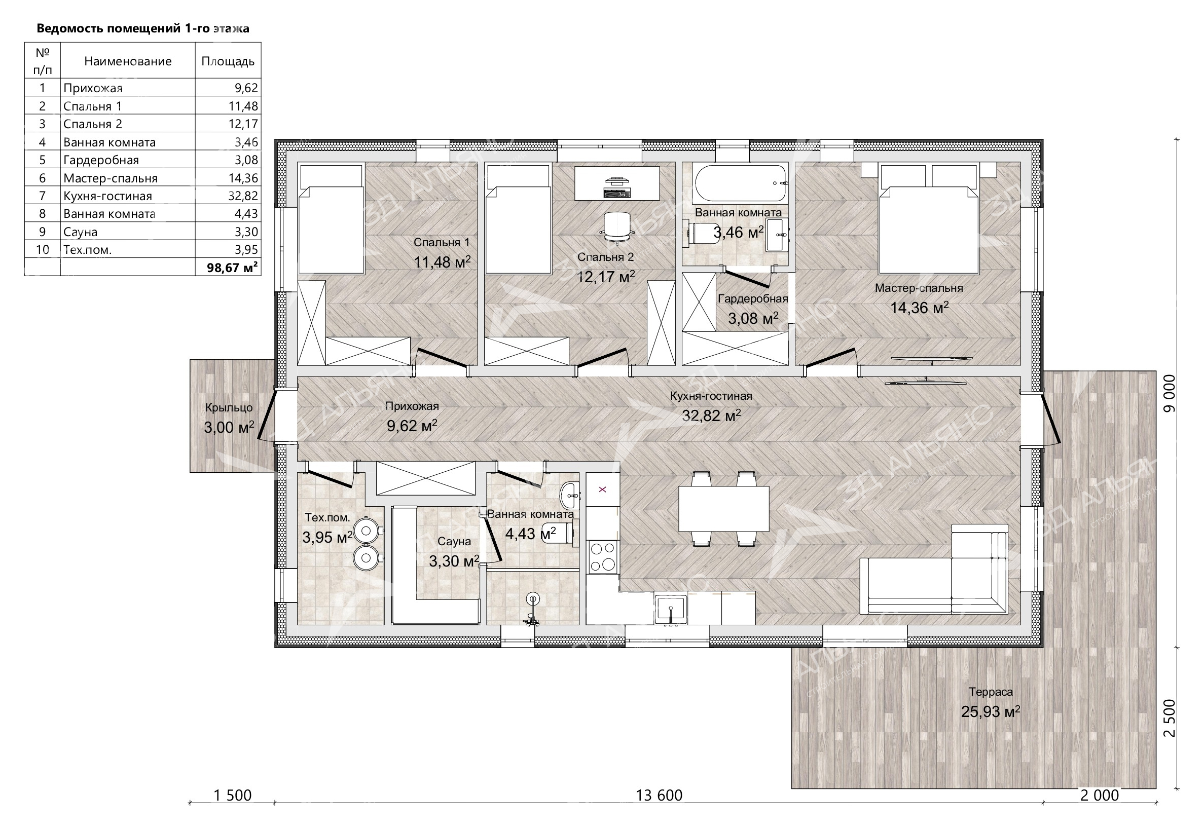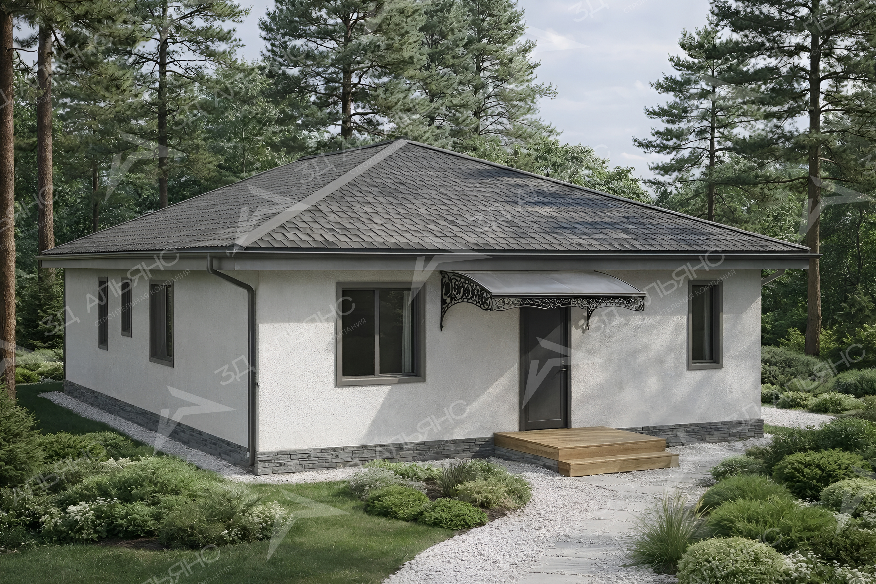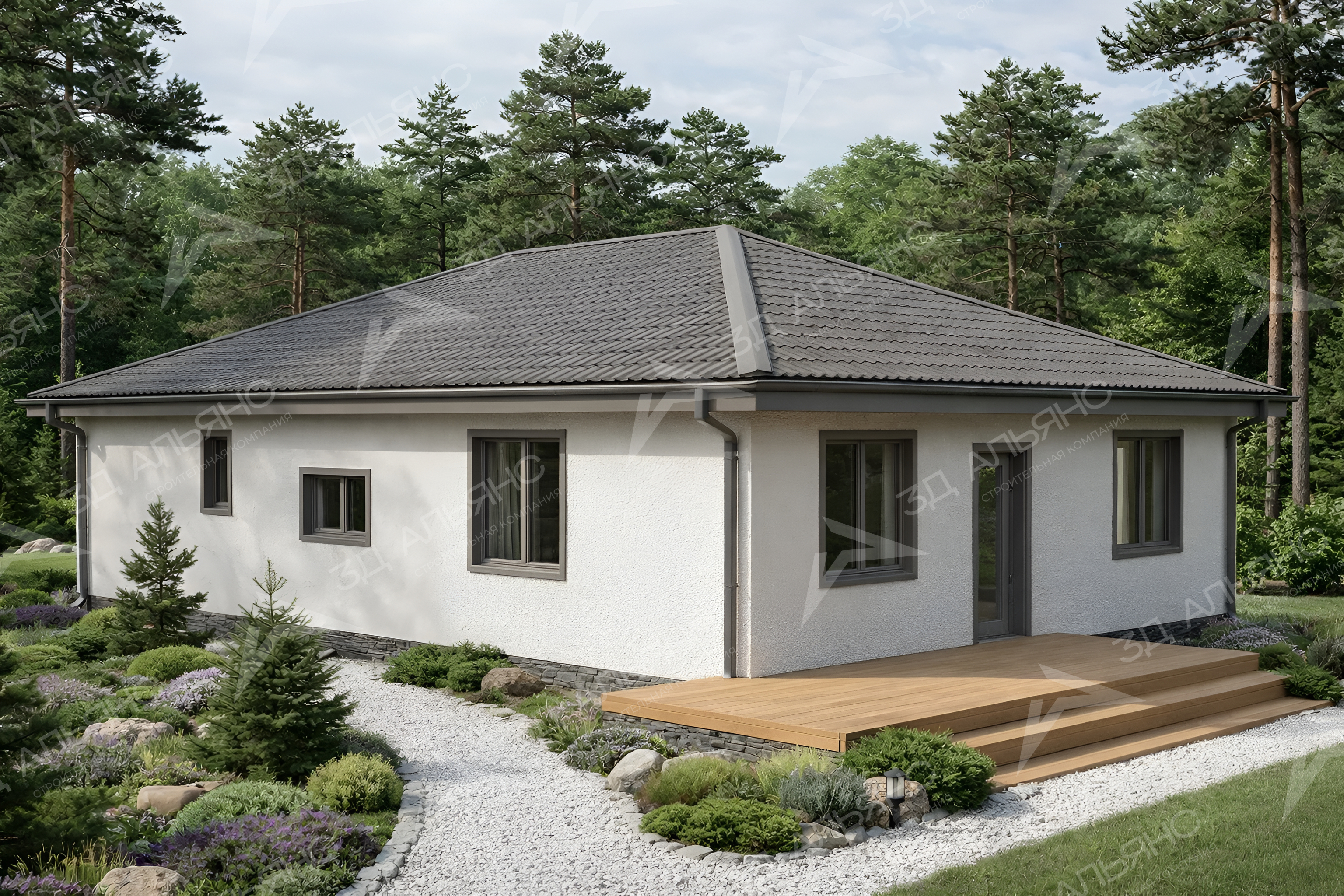 Проект «Мариот» — элегантный одноэтажный дом классического стиля, созданный для радостной повседневной жизни. Кирпичные стены и светлый мокрый фасад придают дому солидность и чистоту линий, а аккуратные серые обрамления окон подчеркивают гармоничные пропорции корпуса 9×13,6 м. Четырёхскатная крыша с тёмной черепицей выглядит респектабельно и надежно, цоколь выполнен под камень — красиво и практично. Планировка площадью 98,67 м² включает 4 комнаты: просторную гостиную-кухню и три уютные спальни. Панорамные окна в зоне гостиной наполняют дом светом и открывают вид на природу, создавая ощущение простора и спокойствия. Из гостиной — прямой выход на широкую террасу: идеальное место для завтраков на свежем воздухе и тёплых семейных вечеров. Уютное крыльцо встречает мягкими ступенями и задаёт гостеприимный тон. На участке выделяется ухоженная гравийная дорожка, хвойники и камни — ландшафт подчеркивает классическую сдержанность дома. Кирпичная основа обеспечивает тепло и тишину круглый год, а мокрый фасад легко держит форму и цвет.
