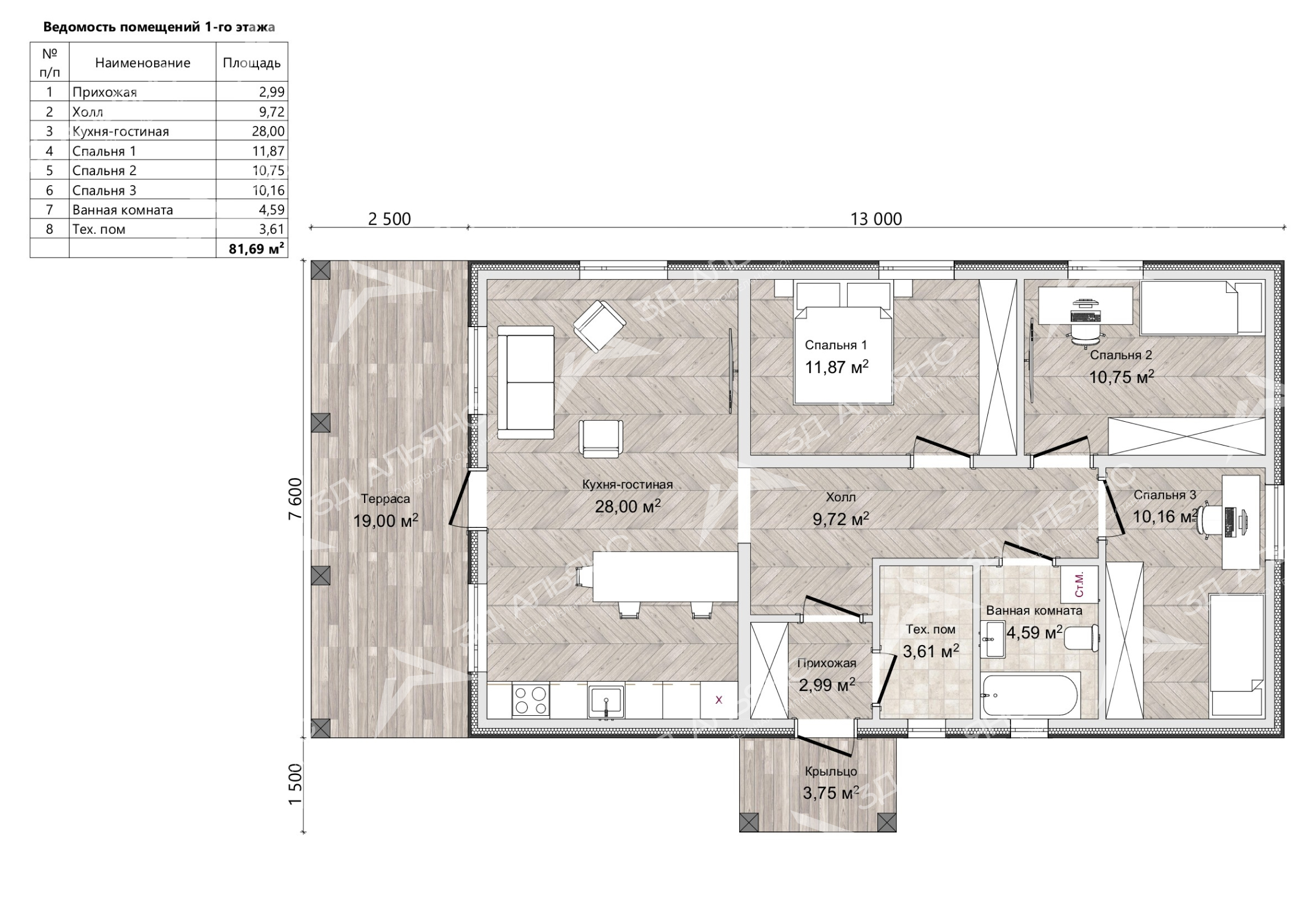 Проект «Вереск» — Современный и комфортный дом из газобетона, общими габаритами 15,5×9,1 м, с полезной жилой площадью 81,69 м2, созданный для тех, кто выбирает удобство, тишину и красоту! Комбинированный «мокрый» фасад с окрашенным в натуральный цвет дерева лиственничным планкеном подчеркивают индивидуальную эстетику дома, а вальмовая кровля с темной черепицей придают дому респектабельность. Отделка природным камнем цоколя и столбов на входной террасе подчеркивает архитектурный стиль и надежность. Здесь все продумано для уюта семейной гармонии: светлая кухня-столовая с гостиной с выходом на большую террасу; три тихие спальни и большая гардеробная. Продуманная геометрия делает планировку компактной и удобной, а газобетон надежно сохраняет тепло зимой и прохладу летом. Пропорциональные окна наполняют дом мягким светом, создавая атмосферу уюта и спокойствия.