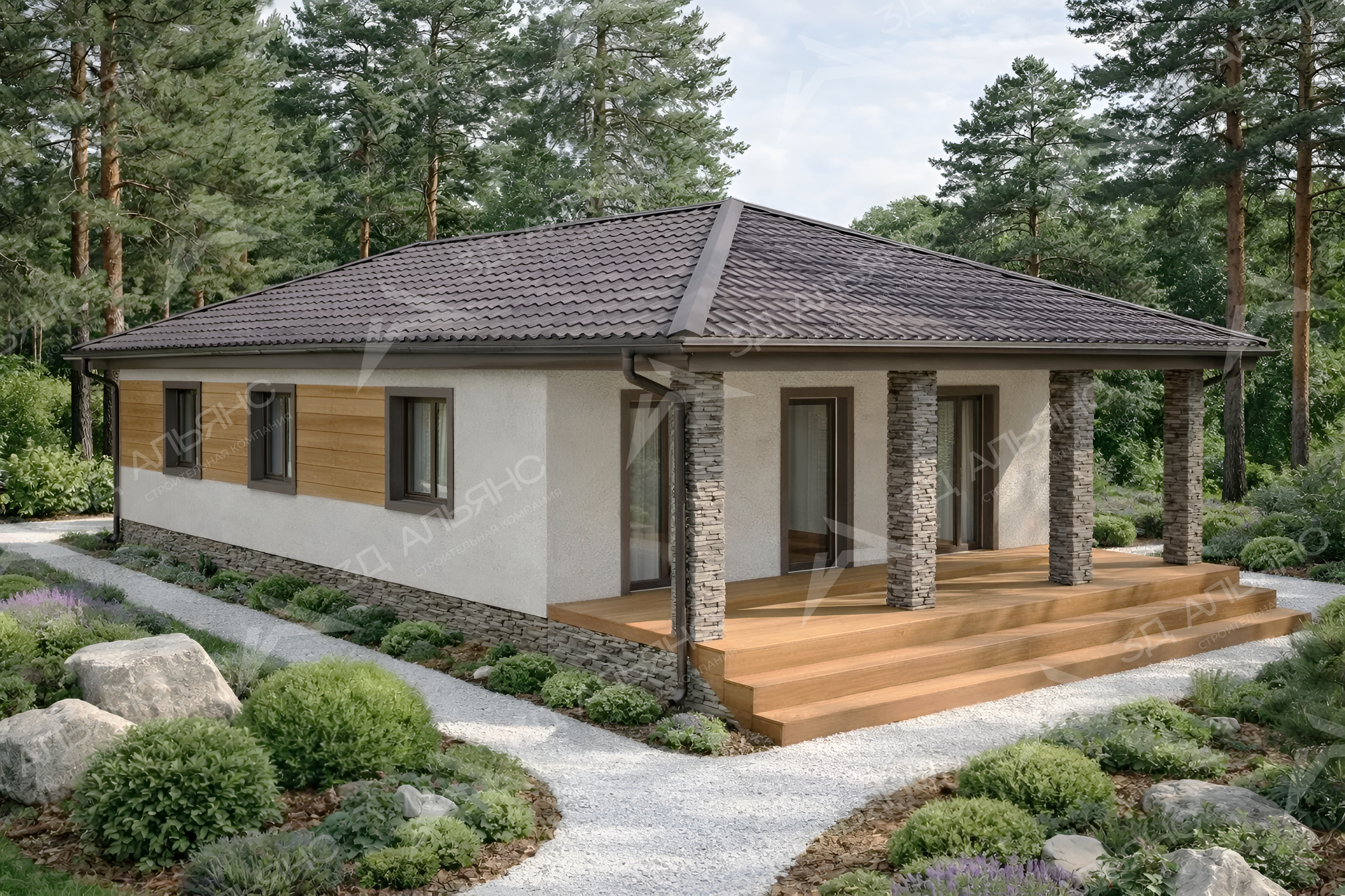 Проект «Вереск» ориентирован на комфорт семьи: одноэтажная эргономика, тихие спальни и уютная терраса для вечерних встреч. Это тот самый дом, где каждый метр работает на комфорт и красоту жизни!