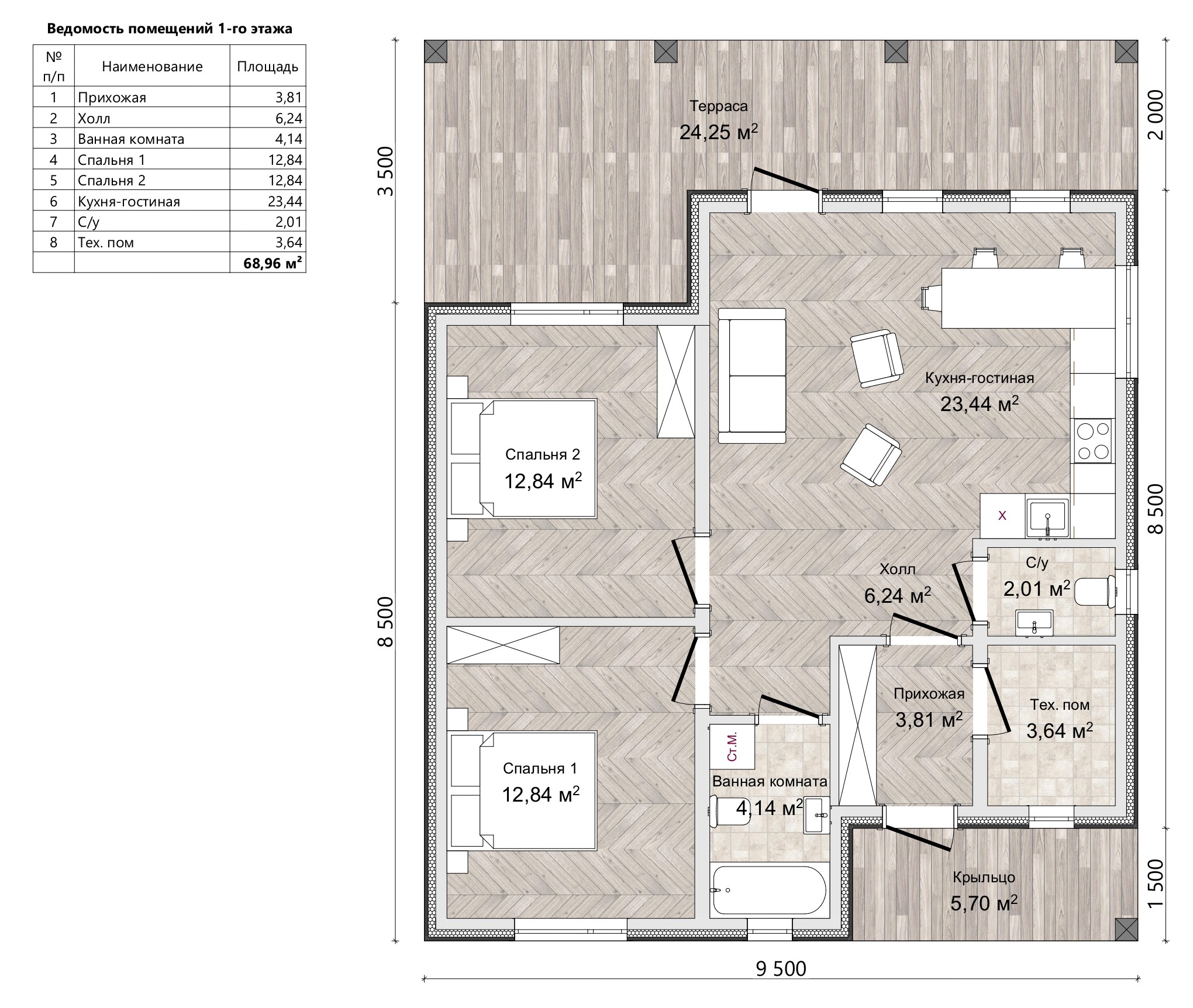 68,96 м2